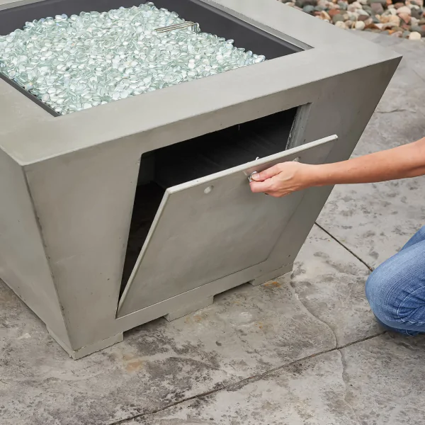 The Cove Square Gas Fire Pit Table is the perfect addition to any contemporary outdoor space. The Natural Grey Supercast concrete lets the focus be on the stunning 24" x 24" Square Crystal Fire Plus burner. The organic, nature of the concrete is unique to each fire pit. Color variations and casual pitting are common attributes to the fire pit.